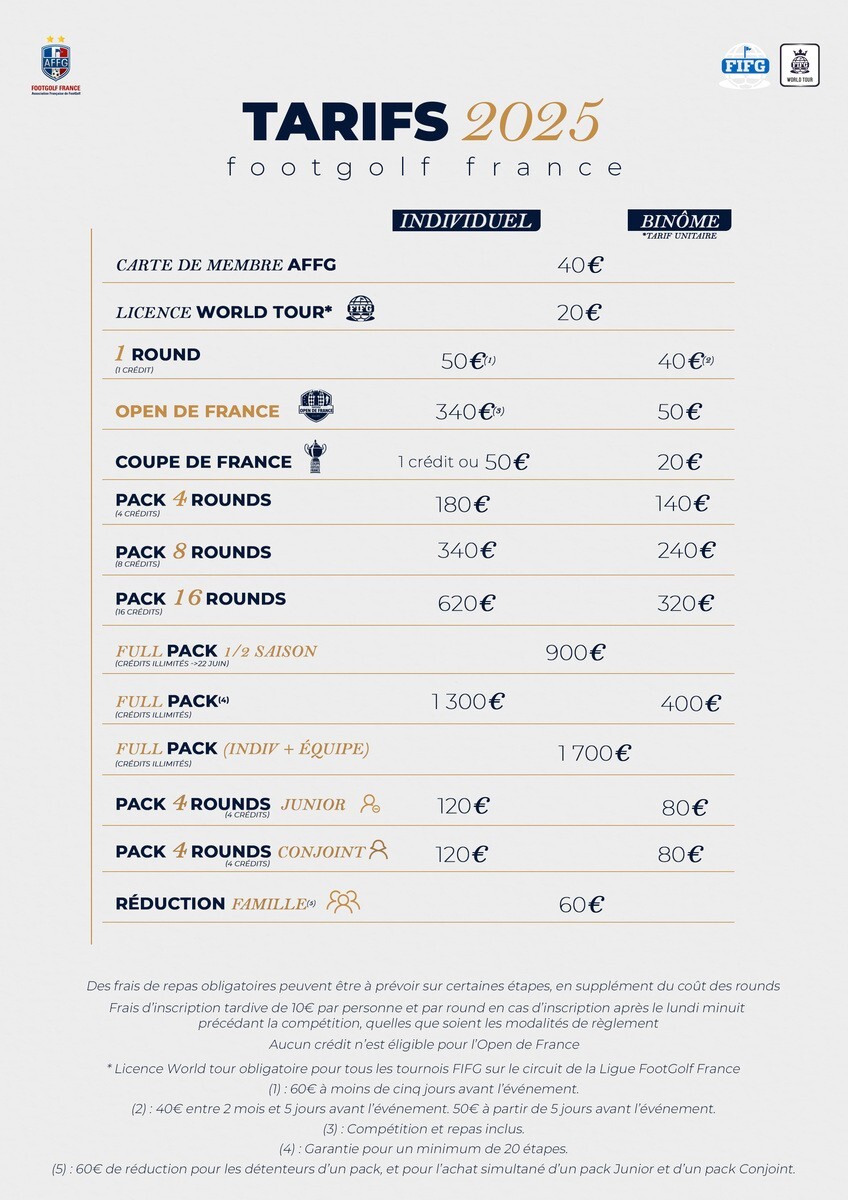 - La carte de membre compétition (40 €) permettra aux joueurs âgés de 18 ans et plus de pratiquer régulièrement le FootGolf dans les règles sur les parcours affiliés AFFG. Elle permettra l'inscription à l'ensemble des compétitions dans le cadre de la FootGolf Cup 2025 et des Tours Régionaux 2025, organisées par l'AFFG.